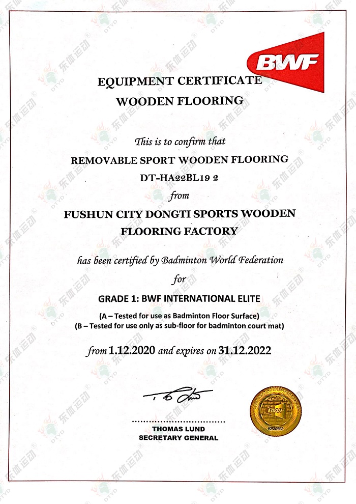 “東體運動”木地板系列產品已經通過國際籃聯檢測、世界羽聯認證、歐盟體育地板專項標準CE認證、歐盟環保產品CE認證、FSC世界森林協會認證、五星級售后服務企業認證等,是中國職業籃球俱樂部遼寧沈陽三生飛豹籃球俱樂部官方合作伙伴,內蒙古籃球協會戰略合作伙伴。